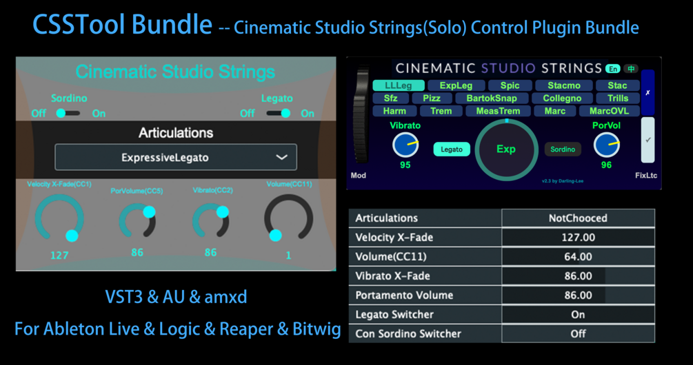 This is a plugin for Cinematic Studio String/Cinematic Studio Strings Solo, with articulations control, latency issue fix, volume (CC11), vibrato X-Fade (CC2), portamento volume (CC5), and velocity X-Fade(CC1) control functions. It includes two plugins, one is CSSTool, and the other is 330msCompensator (providing 330ms delay compensation for tracks), where: